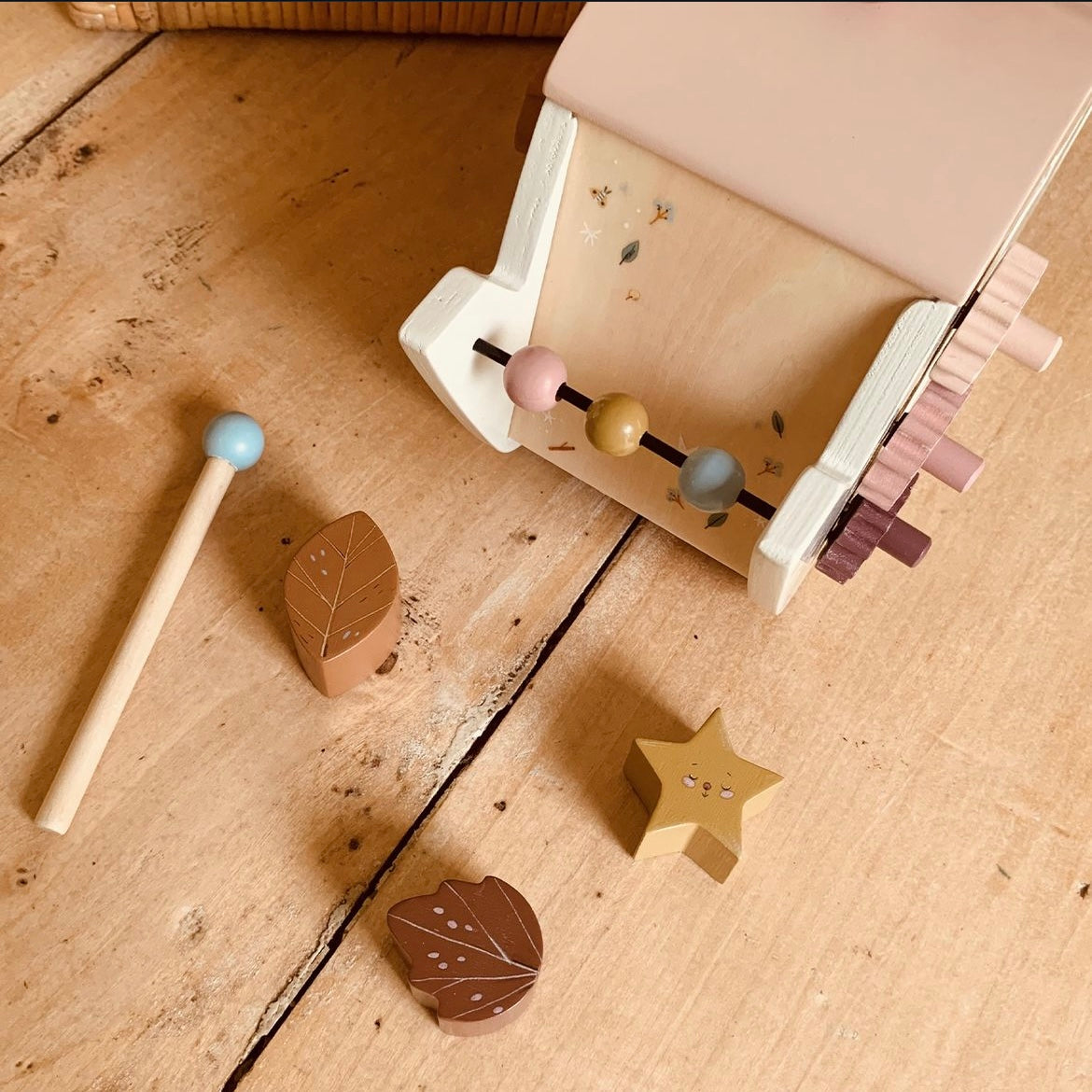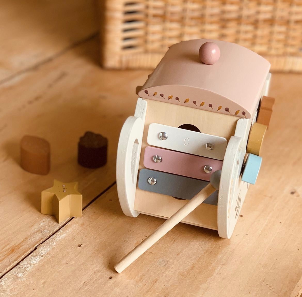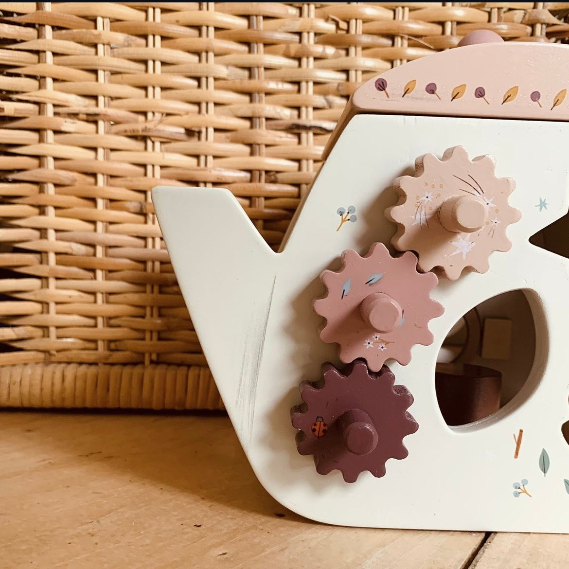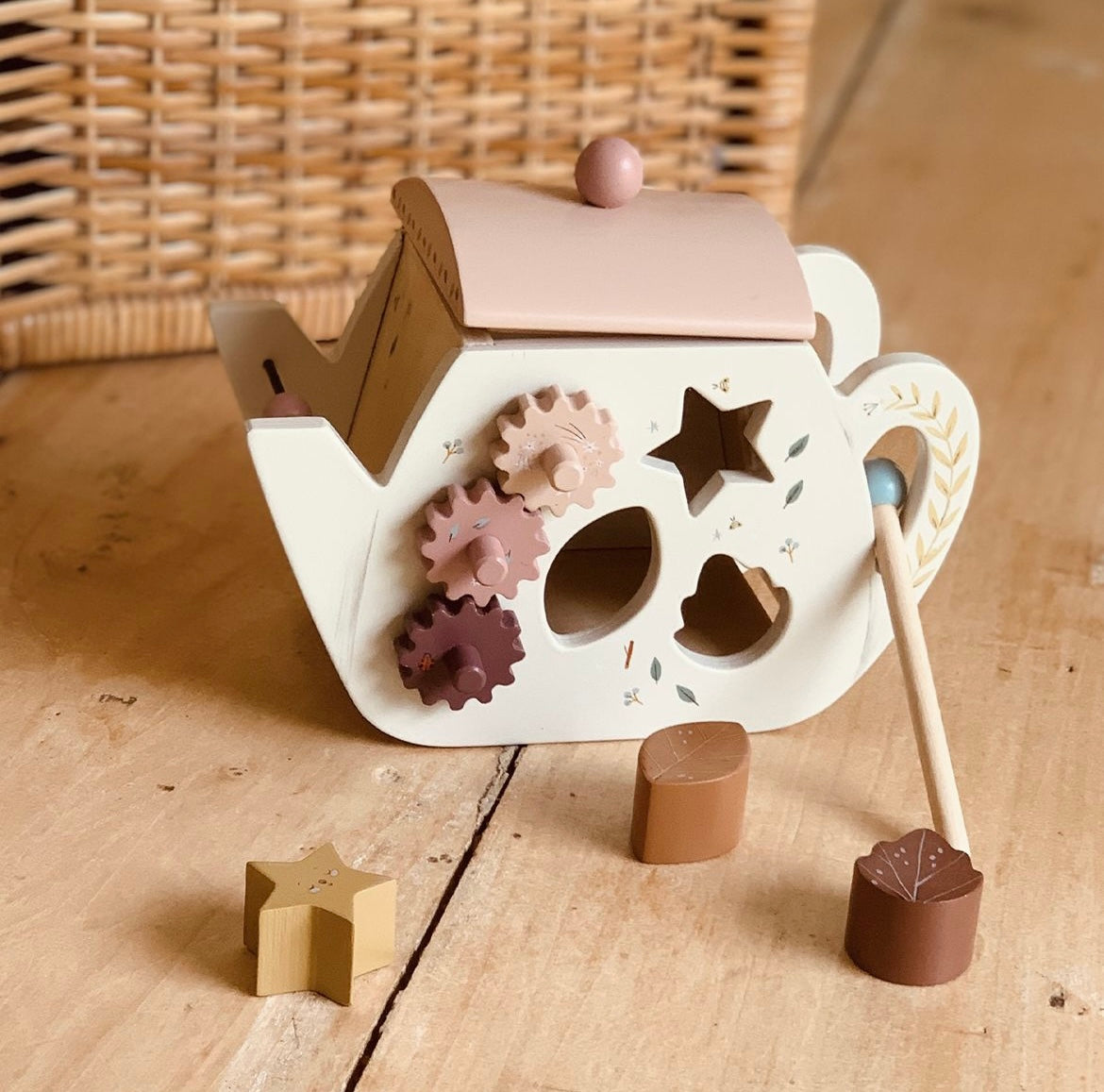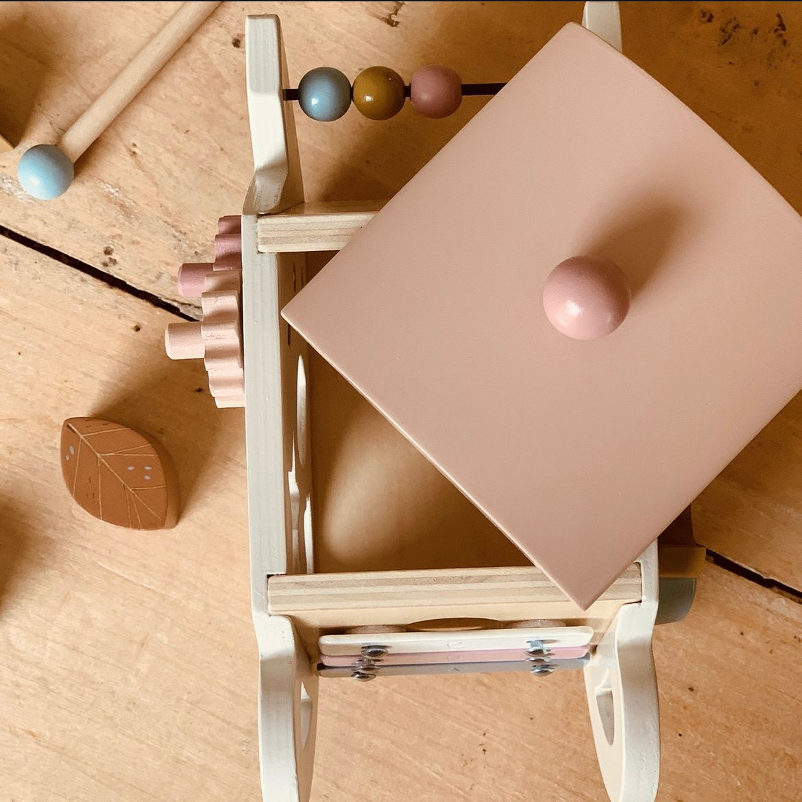 A lovely wooden activity teapot toy for baby! Each of the 4 sides has fun learning activities to explore: an abacus, shape sorter, cogged wheels to turn, and a xylophone. There's even a little hidden mirror! Get your little one engaged (in multiple ways) and having a ball. They'll learn musical sounds and numbers while honing their motor skills.