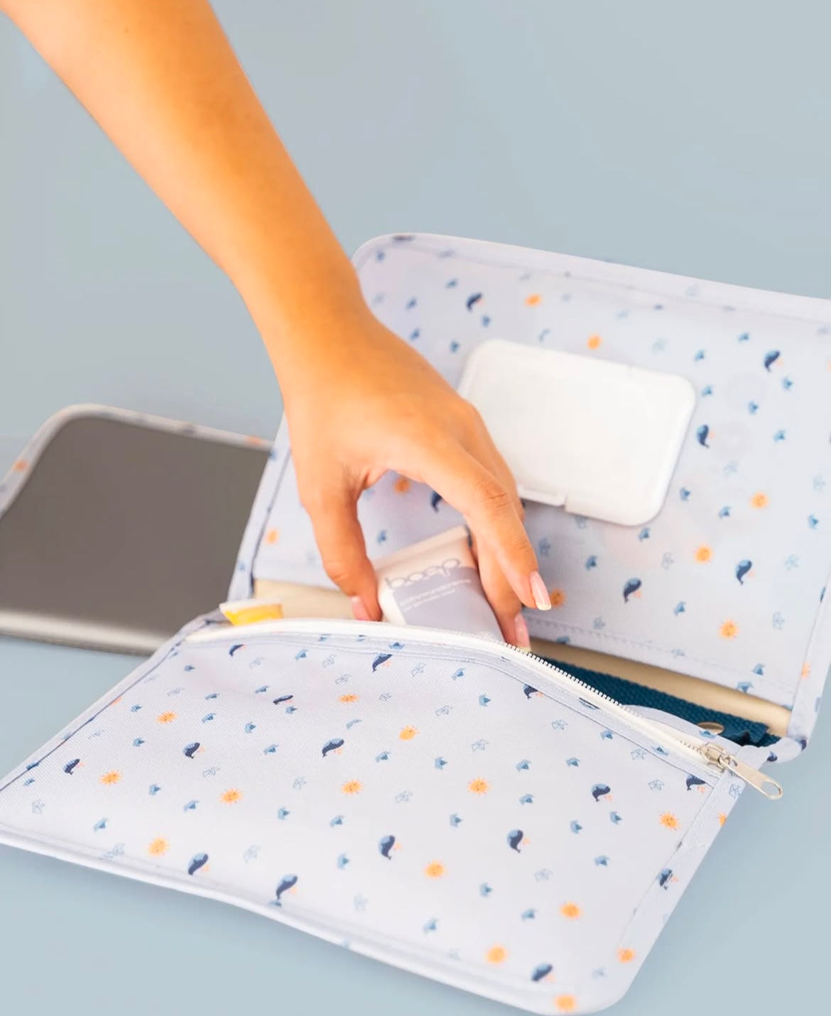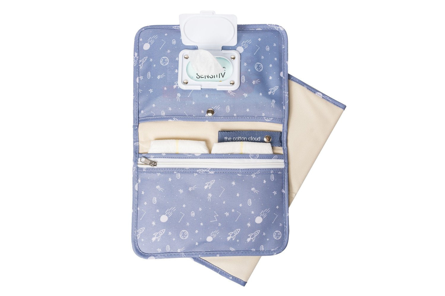 A practical diaper bag with iconic patterns is the perfect companion for parents who always want to be well prepared. This multifunctional bag not only offers a large changing mat, but also a refillable wet wipe container and a spacious zipped pocket in which you can neatly store all important changing items such as diapers, creams and wet wipes.